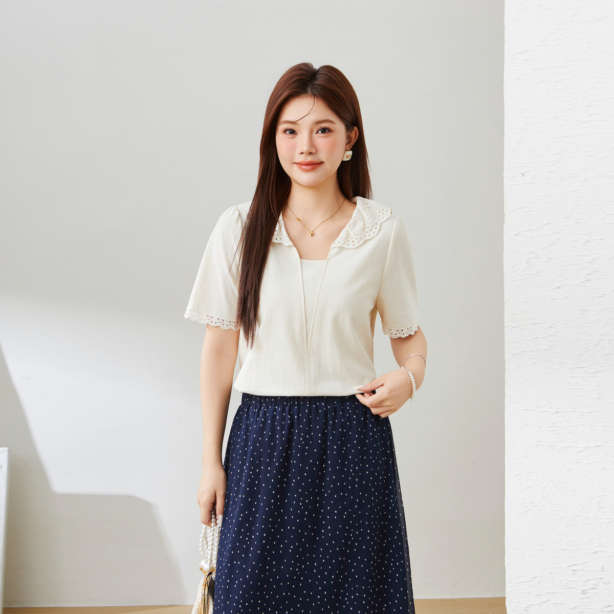 Caiduobao プラスサイズの女性のファット mm2025 夏の新しいフレンチ中空レース V ネックシャツ EXA5302