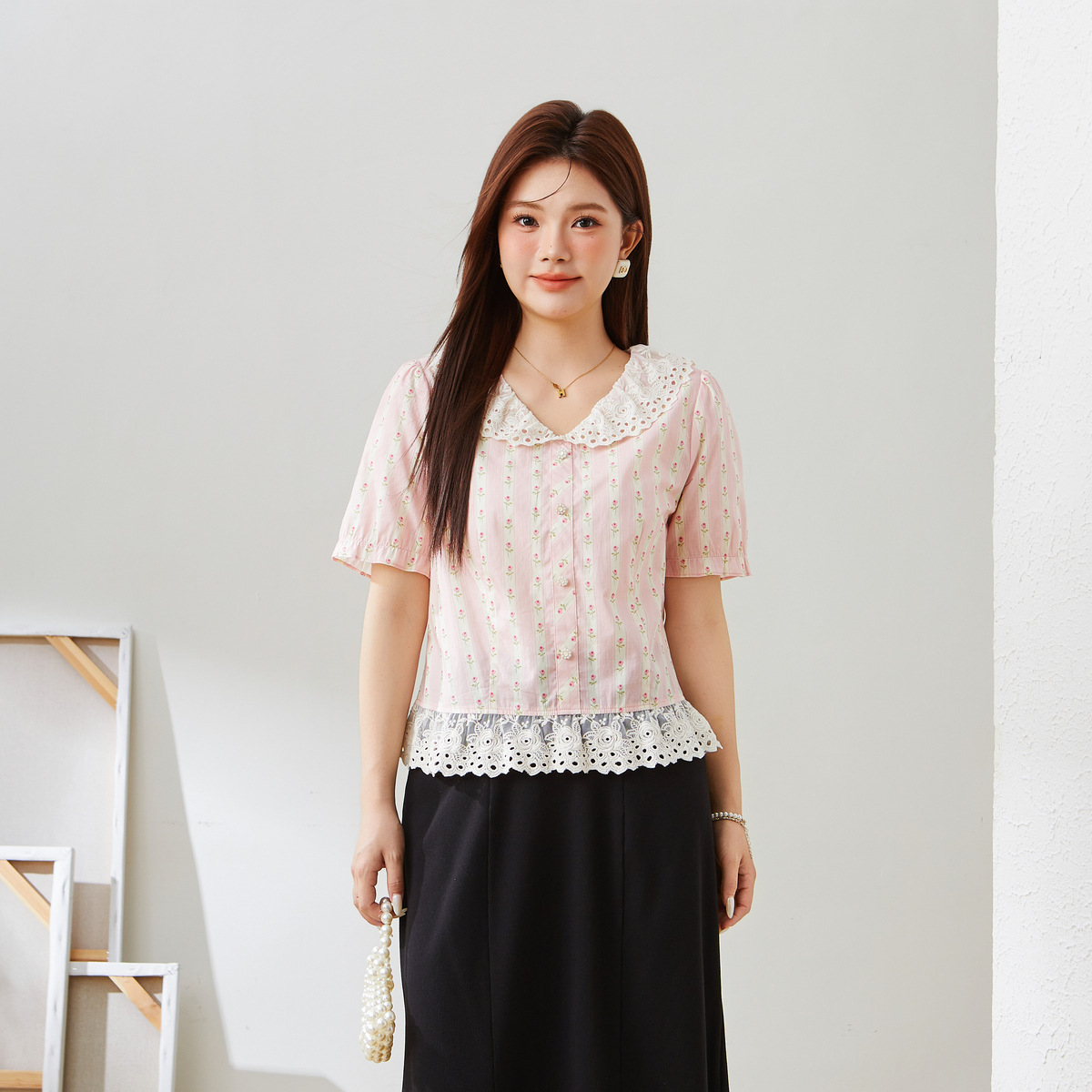 Caiduobao プラスサイズの女性のファット mm2025 夏の新しいスタイルのベビードール襟花柄コットンシャツ EXA5553