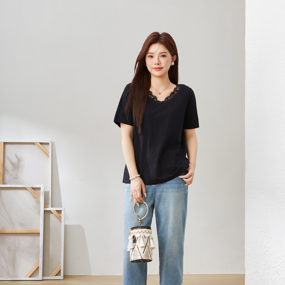 Caiduobao プラスサイズの女性のファット mm2025 夏の新しい大きなラウンド V ネックレースステッチ痩身トップ EXZ5253