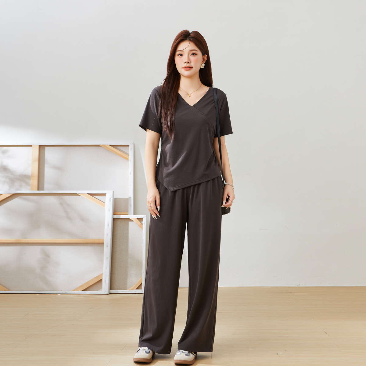 Caiduobao プラスサイズの女性のファット mm2025 夏の新しい V ネックウエスト縮小不規則なワイドレッグスーツ EXZ5526