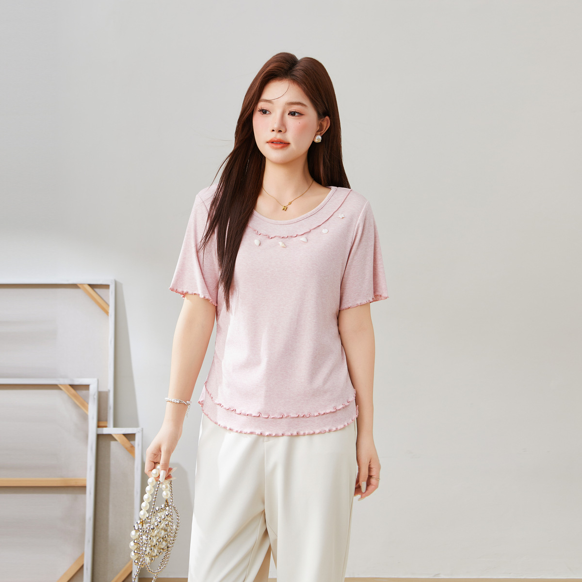 Caiduobao プラスサイズの女性のファット mm2025 夏の新しいラウンドネック耳貝装飾 Tシャツ EXZ5529