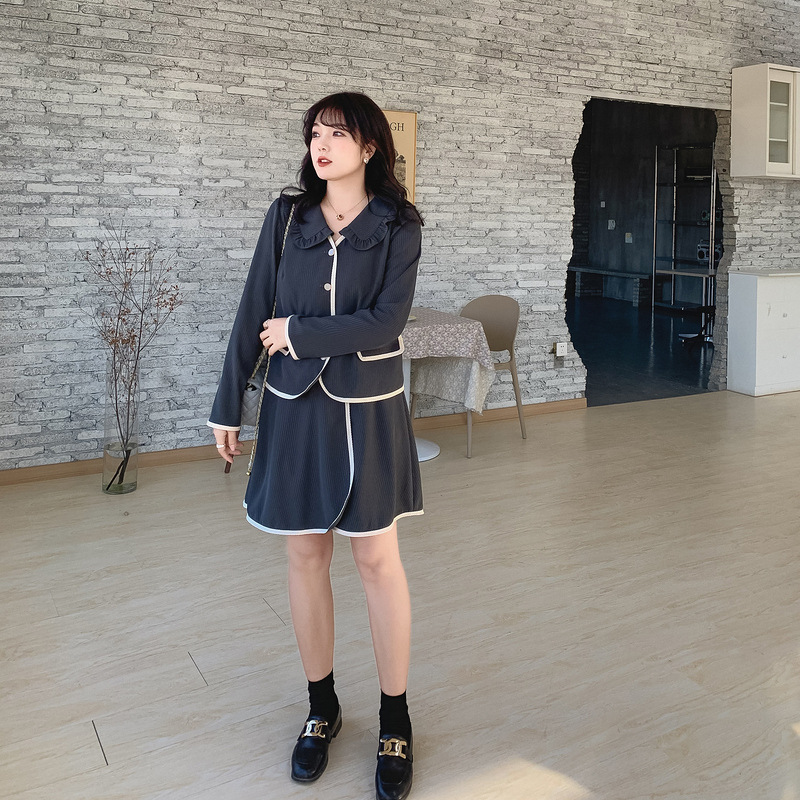 採多宝の大きいサイズの婦人服の太った妹の2021年の春の服は襟の木の耳元をめくって色の織帯の2つのセットをつけます。