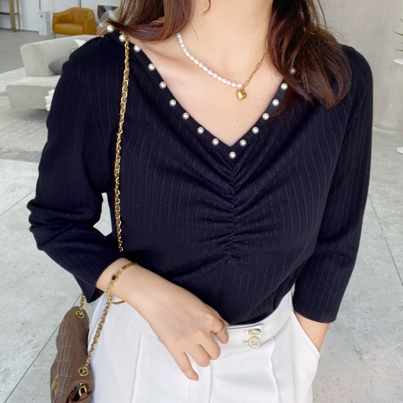 ジェーンウェイの大きいサイズの婦人服の太ったmm2021秋の新型の甘い真珠のvネックのニットのtシャツ