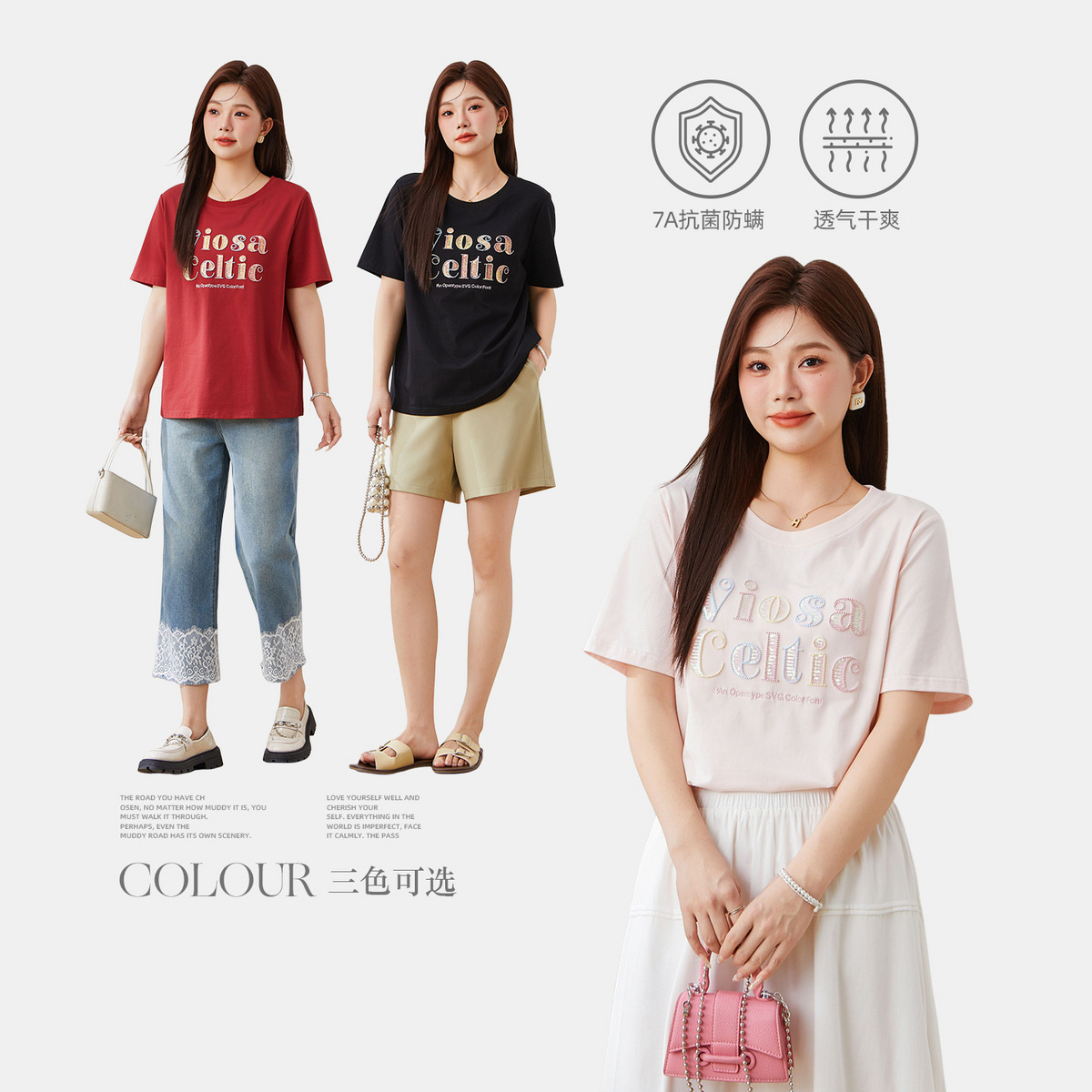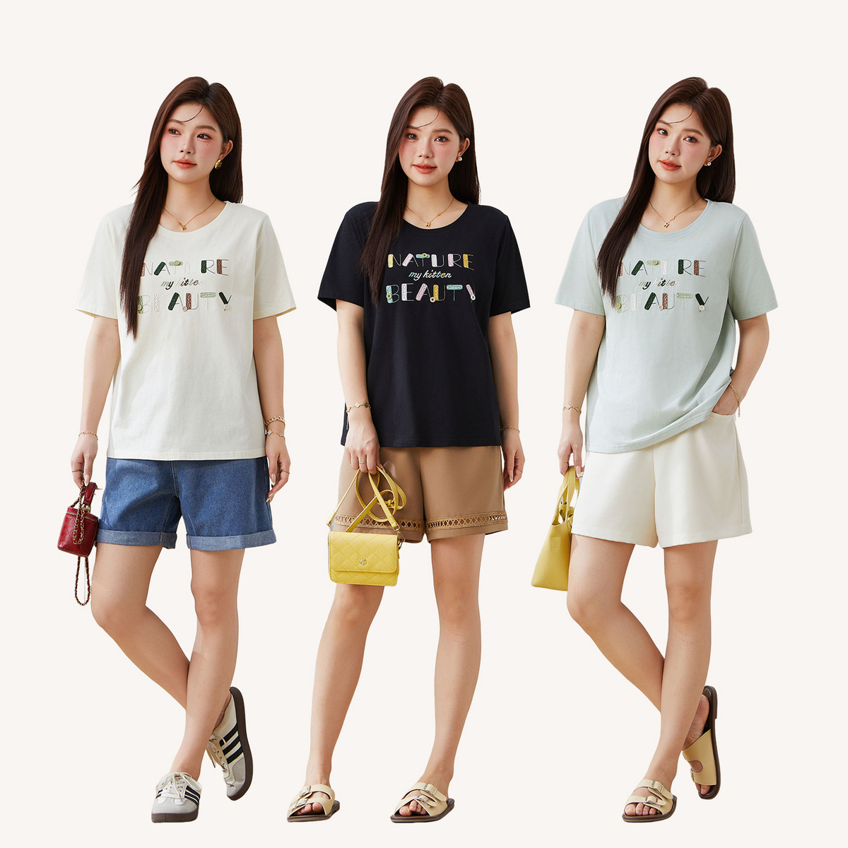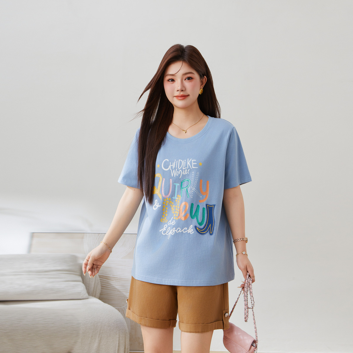 Caiduobao プラスサイズの女性のファット mm2025 夏の新ルーズコットンラウンドネックレター刺繍 Tシャツ EXZ5187