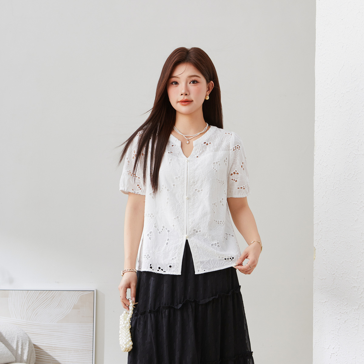 Caiduobao プラスサイズの女性のファット mm2025 夏の新しい V ネック中空綿刺繍トップ EXA5321
