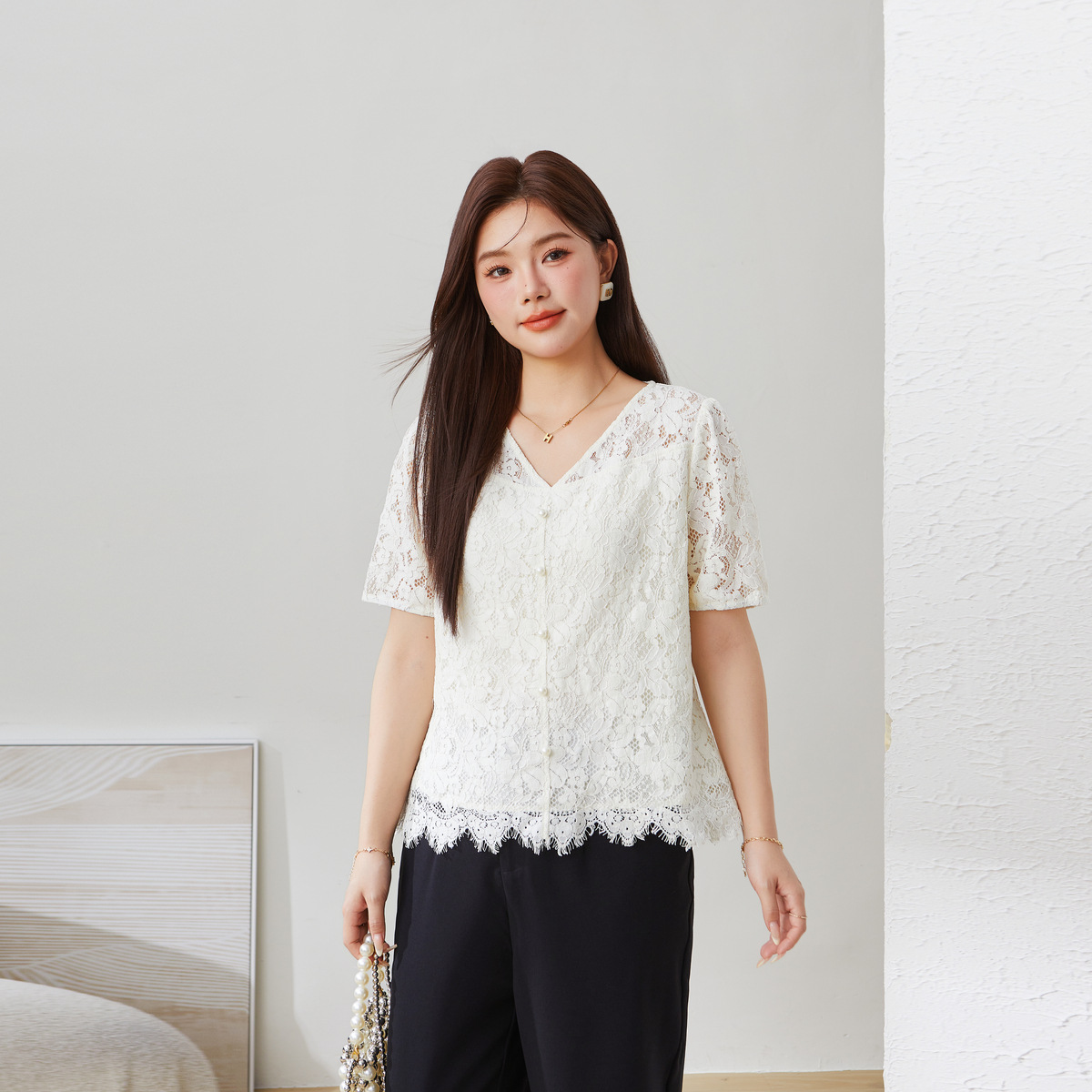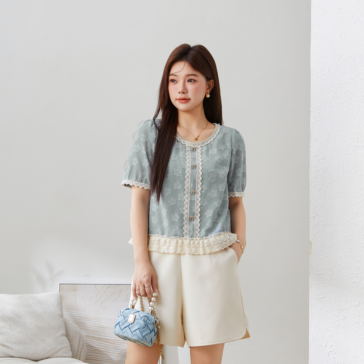 Caiduobao プラスサイズの女性のファット mm2025 夏の新しい気質ジャカードスプライシングレースシャツ EXA5208