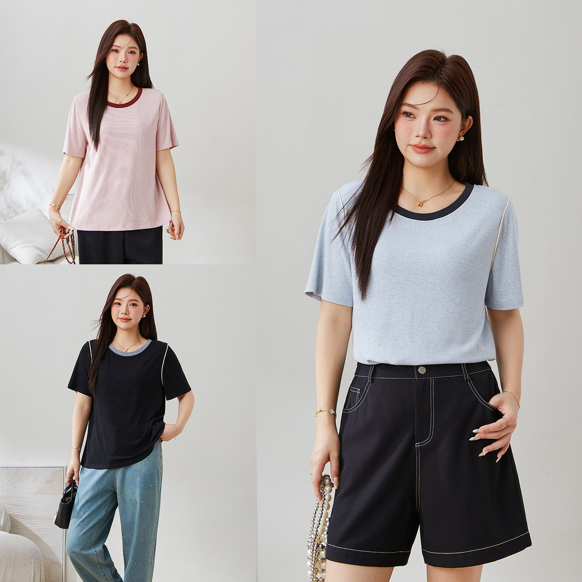 Caiduobao プラスサイズの女性のファット mm2025 夏の新コントラストカラーラウンドネックルーズセーター EXZ5202