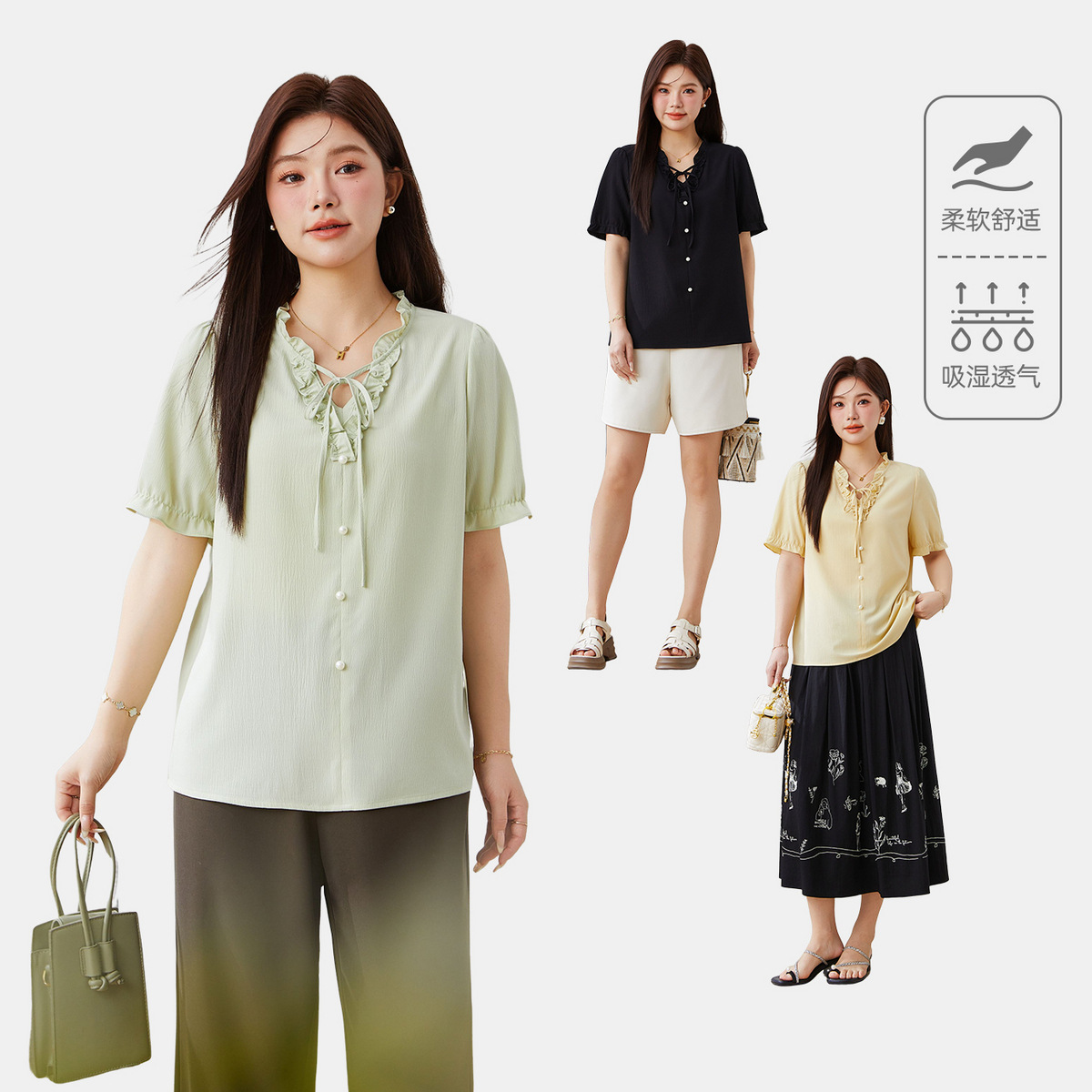 Caiduobao プラスサイズの女性のファット mm2025 夏の新しいスタイルの耳ストラップパフスリーブシャツ EXA5158
