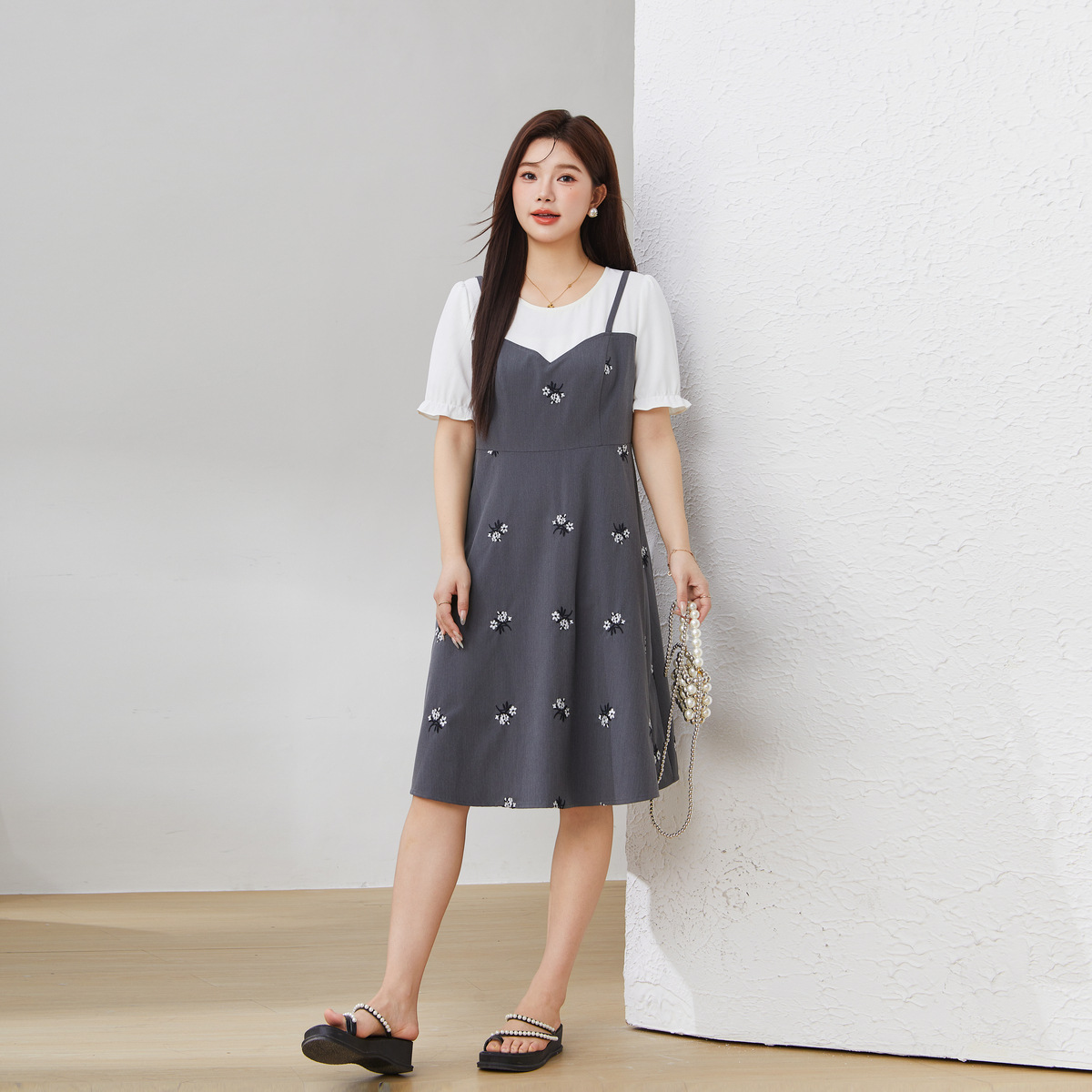 Caiduobao プラスサイズの女性のファット mm2025 夏の新しいスタイル偽ツーピースサスペンダー刺繍ドレス EXQ5039
