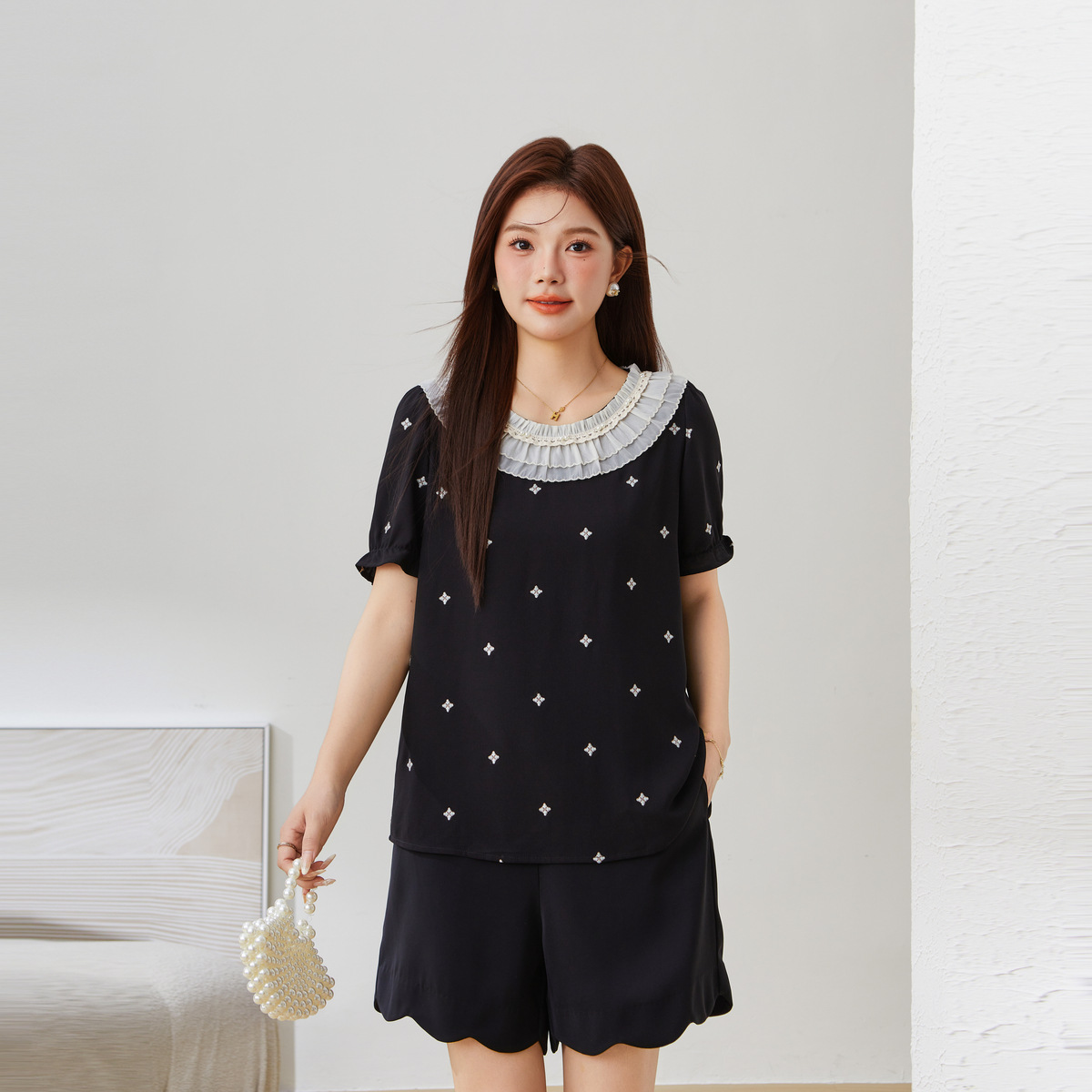 Caiduobao プラスサイズの女性のファット mm2025 夏の新しいフレンチビーズレースカラーブロックシャツ EXA5301