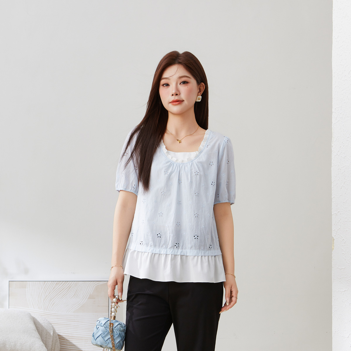 Caiduobao プラスサイズの女性のファット mm2025 夏の新しいスタイルのフランス刺繍中空スリムトップ EXA5307