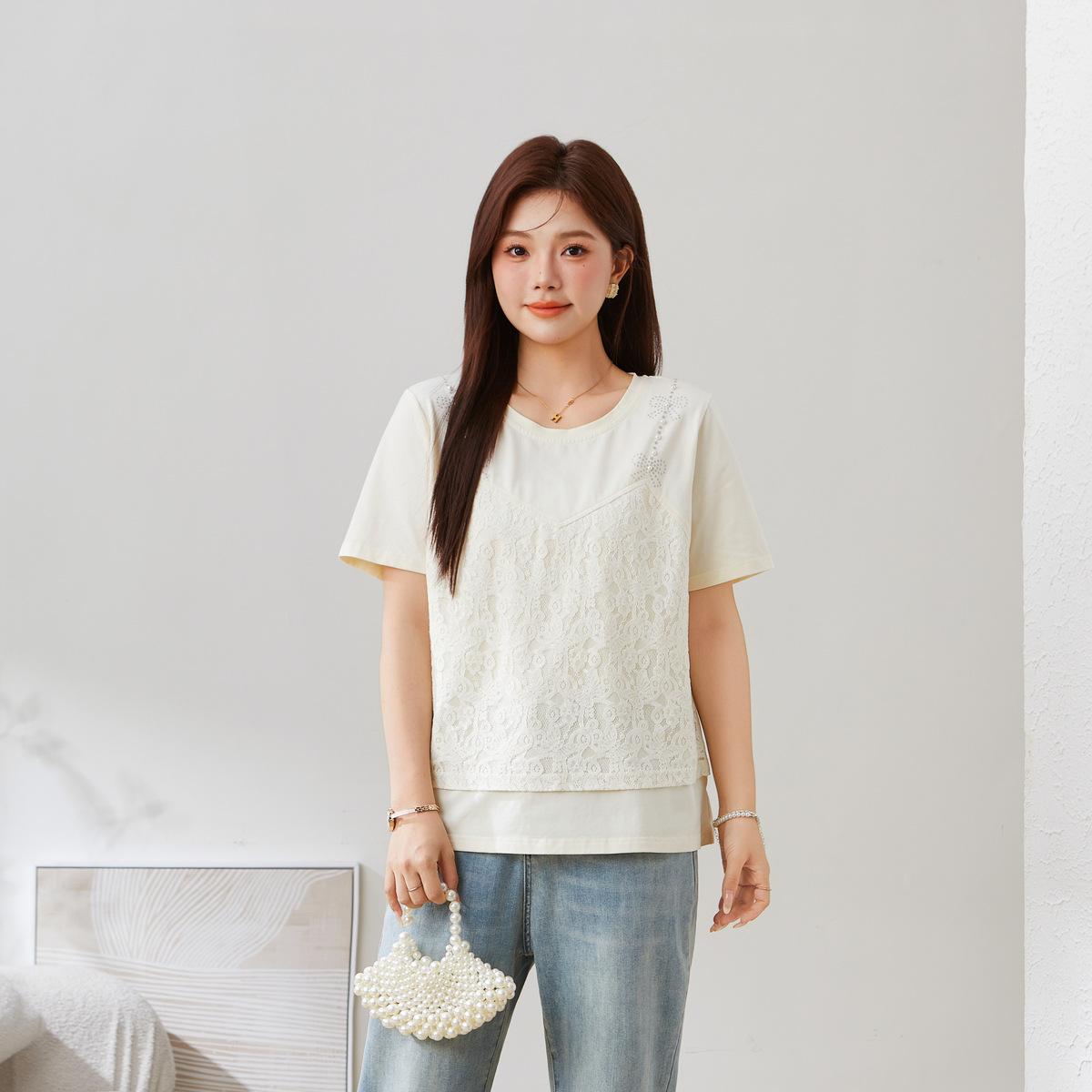Caiduobao プラスサイズの女性のファット mm2025 夏の新しい偽ツーピースレースステッチパール Tシャツ EXZ2967
