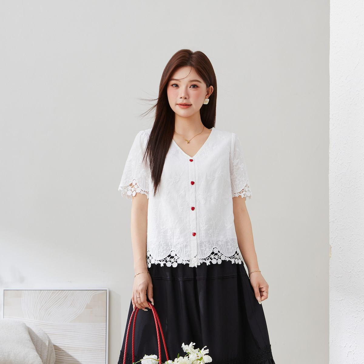 Caiduobao プラスサイズの女性のファット mm2025 夏の新しい V ネック波状レース綿刺繍シャツ EXA5285