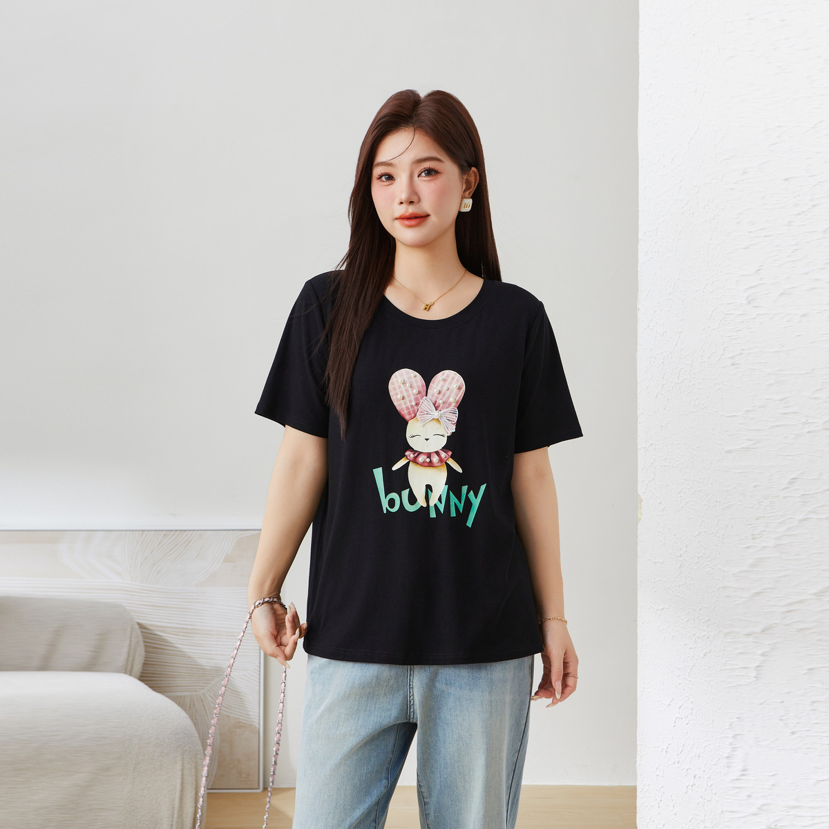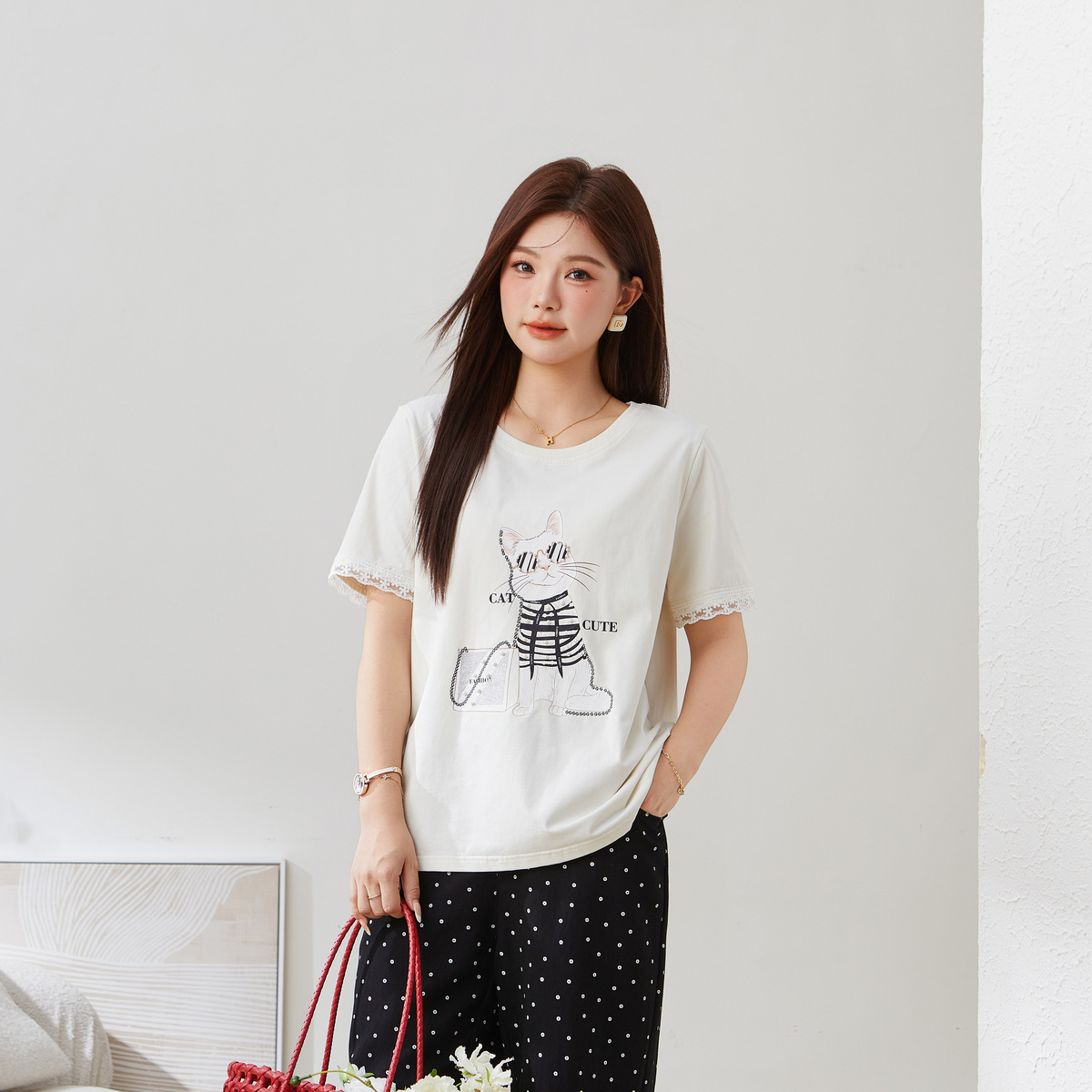 Caiduobao プラスサイズの女性のファット mm2025 夏の新しいかわいい猫プリント甘いスタイルニット Tシャツ EXZ5305