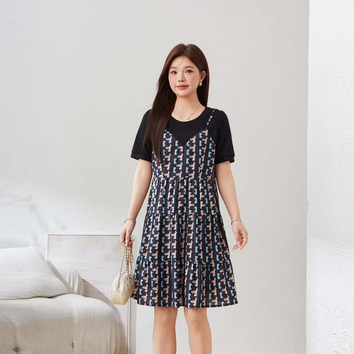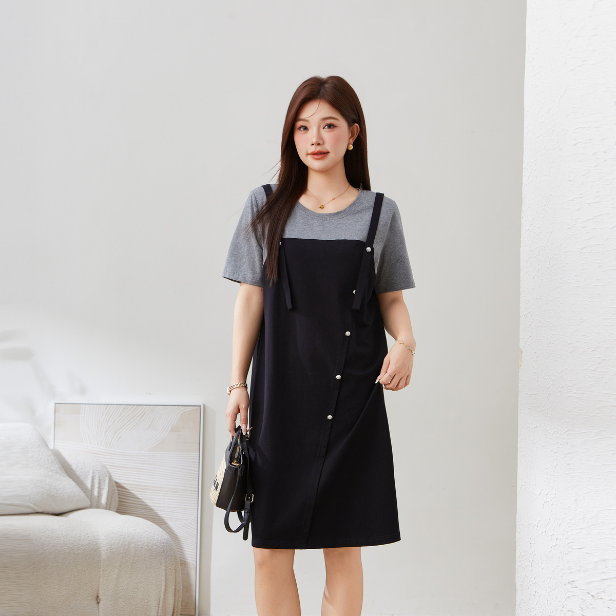 Caiduobao プラスサイズの女性のファット mm2025 夏の新コントラストカラーフェイクツーピースミッドレングスドレス EXQ5298