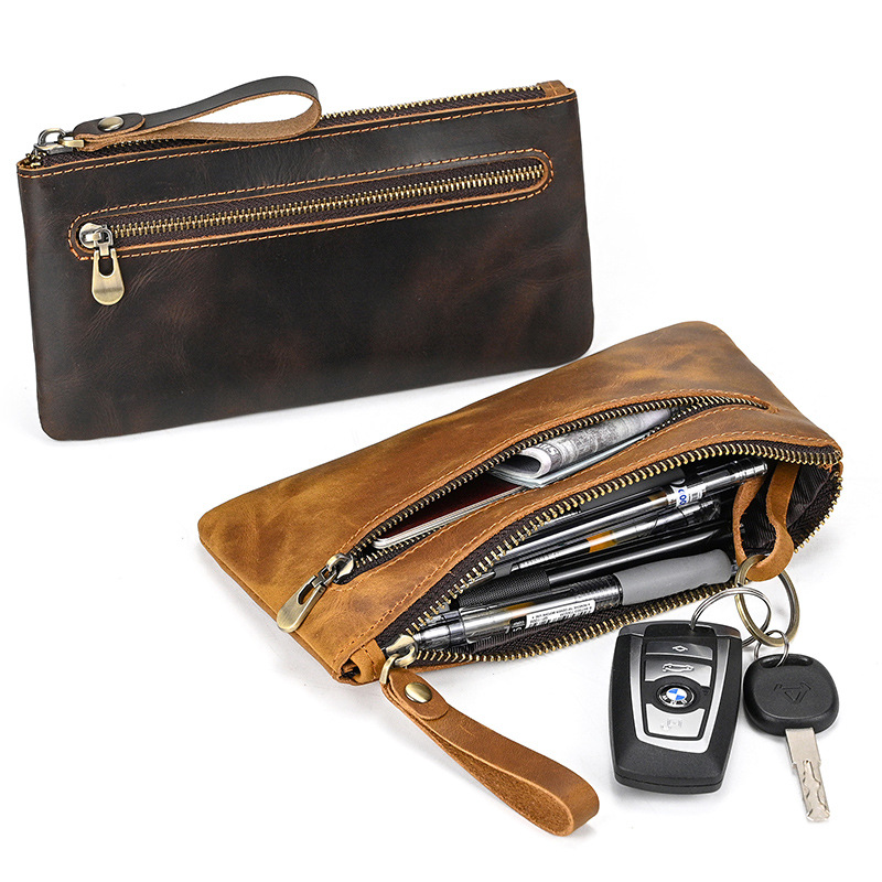 狂馬皮男性本革長財布レトロファスナーハンドバッグ