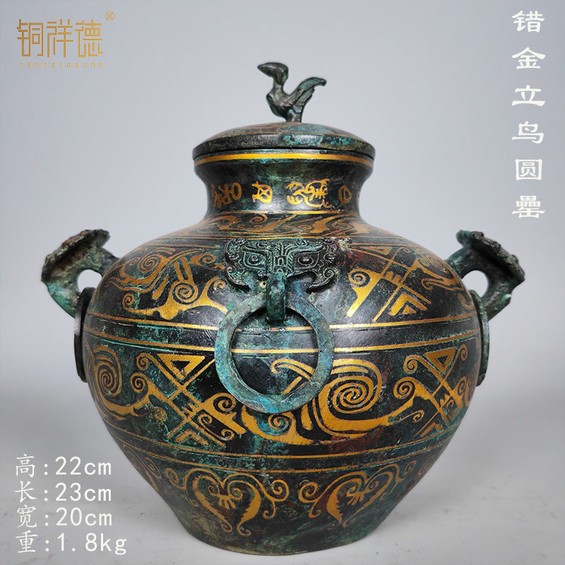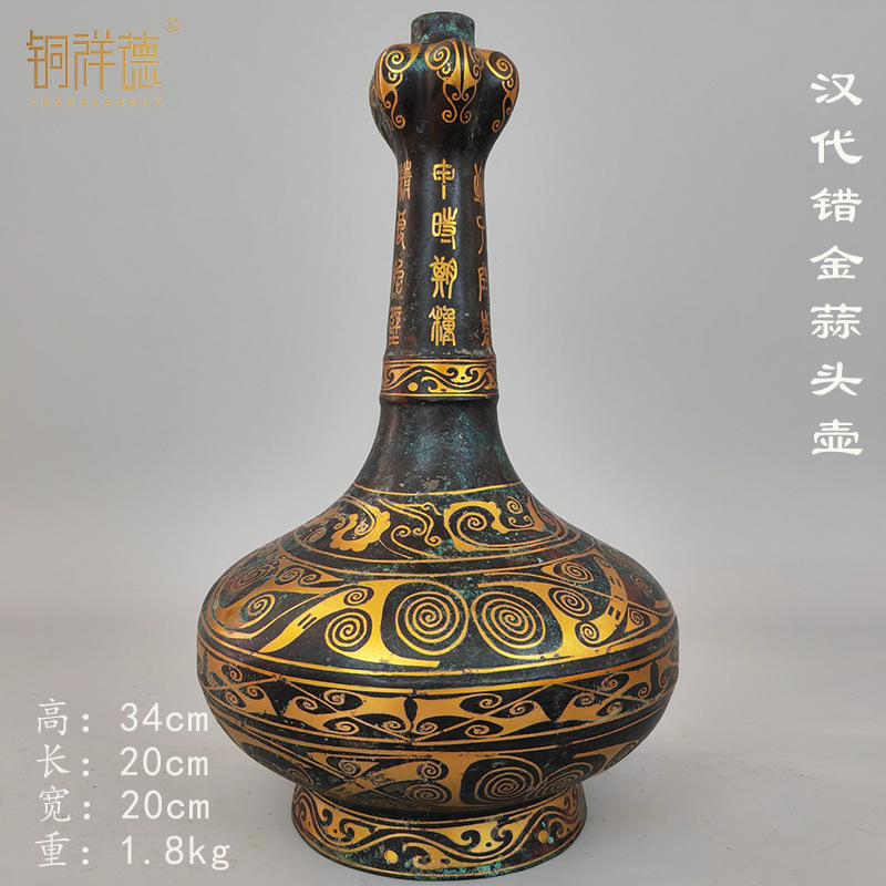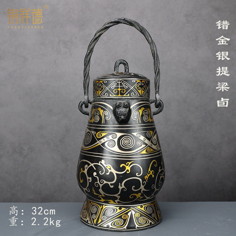 銅祥徳古青銅器置物青銅提梁金金銀黒皮包糊古代盛酒壺置物
