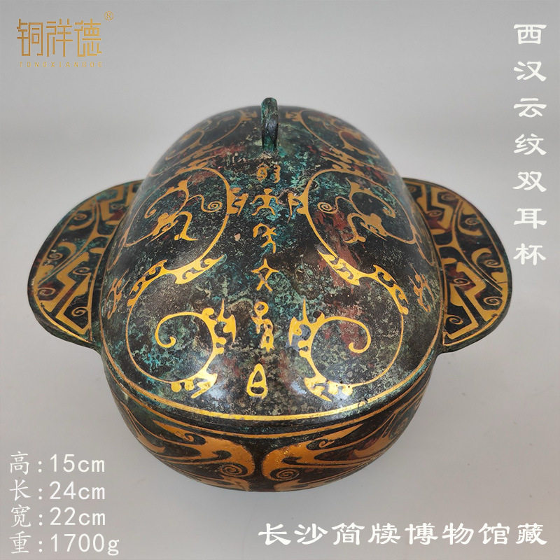 金と銀の銅器の置物の青銅の金の西の漢の雲の紋様の双耳の杯の青銅器の骨董品の置物