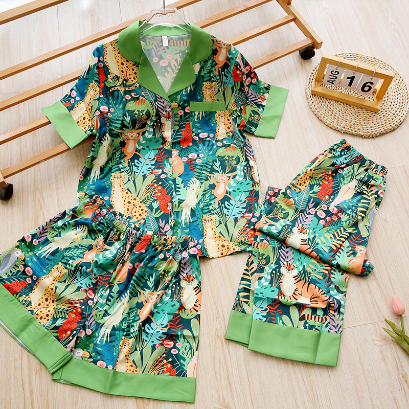 パジャマ女性春夏シルク氷糸半袖ズボン三点セット薄手国風カジュアル快適ホームウェア