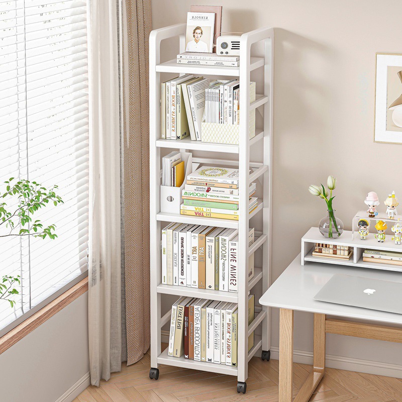 本棚の棚が床に落ちている多層の収納棚の鉄芸の狭い家庭用棚の机の横の簡易移動の小さい本棚