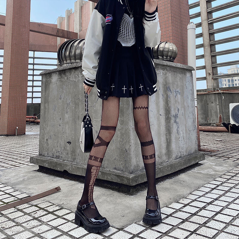 JKレトロ風パッチワークタイ付きパンスト薄手ストッキングローズプリントサイドカットアウト網タイツY2Kパンスト