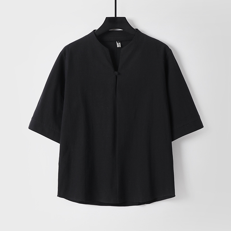 中国風メンズ半袖tシャツ夏レトロメンズvネック綿麻半袖大きいサイズゆるいリネン五分袖男