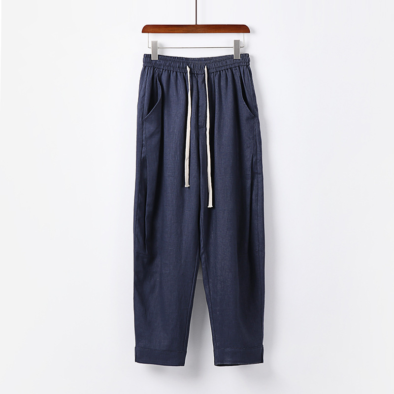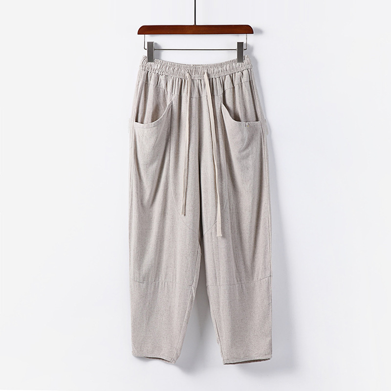 中国風亜麻九分ズボン男性夏ファッション純色綿麻カジュアルズボンゆるいデブ束足ハーレムズボン