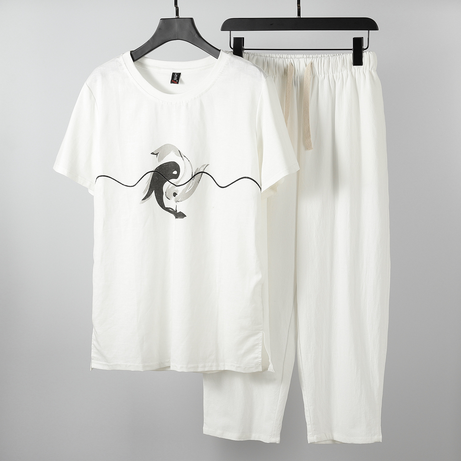 夏は太った大きいサイズの男性服がゆったりしている半袖tシャツの9分のズボンのスーツの2セットの綿麻の亜麻の潮が太っている2セットです。
