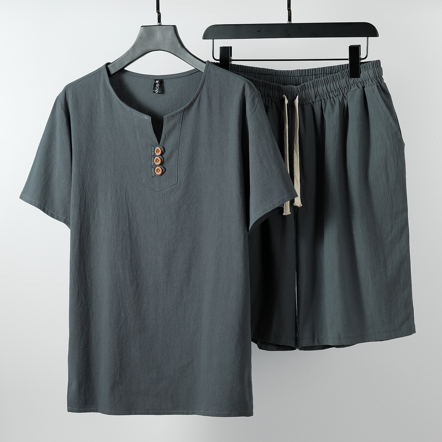 亜麻半袖セット男性夏薄手tシャツ潮中国風メンズ綿麻レトロ立襟2点セット