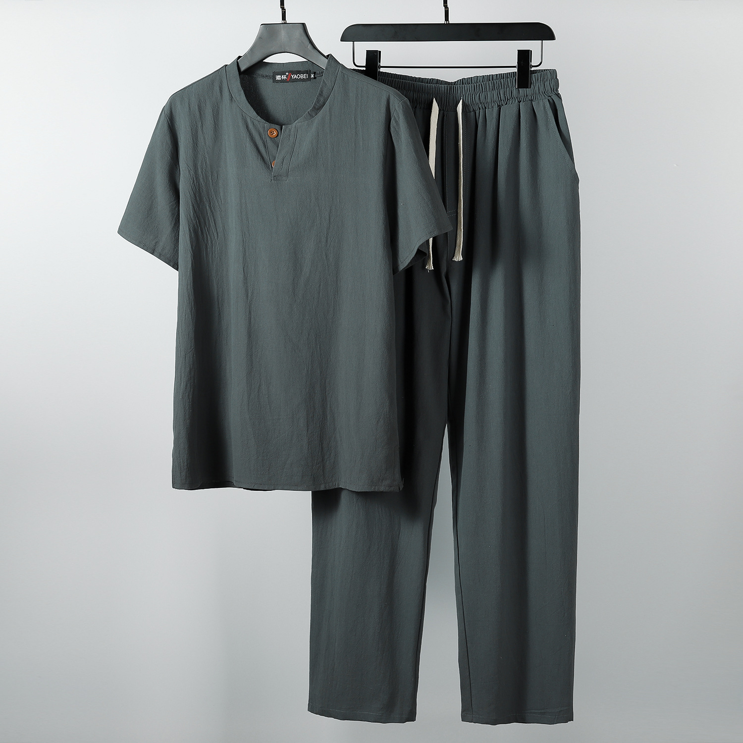 薄い半袖男性tシャツセット夏中国風ゆるい丸首半袖上着綿麻ズボン2点セット男性服