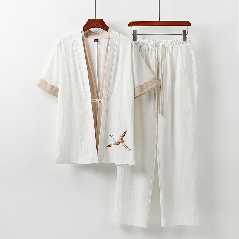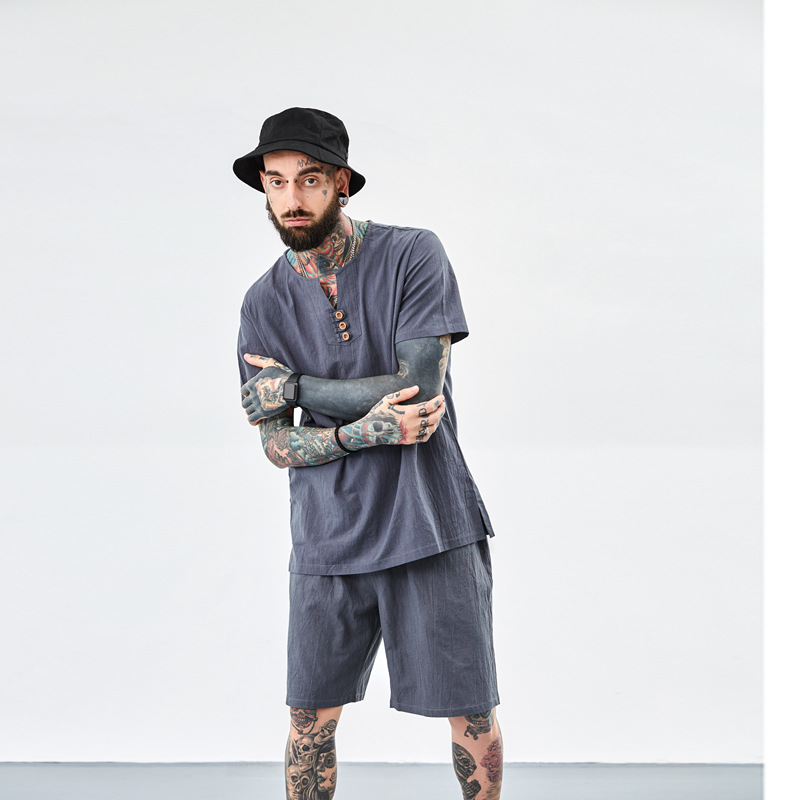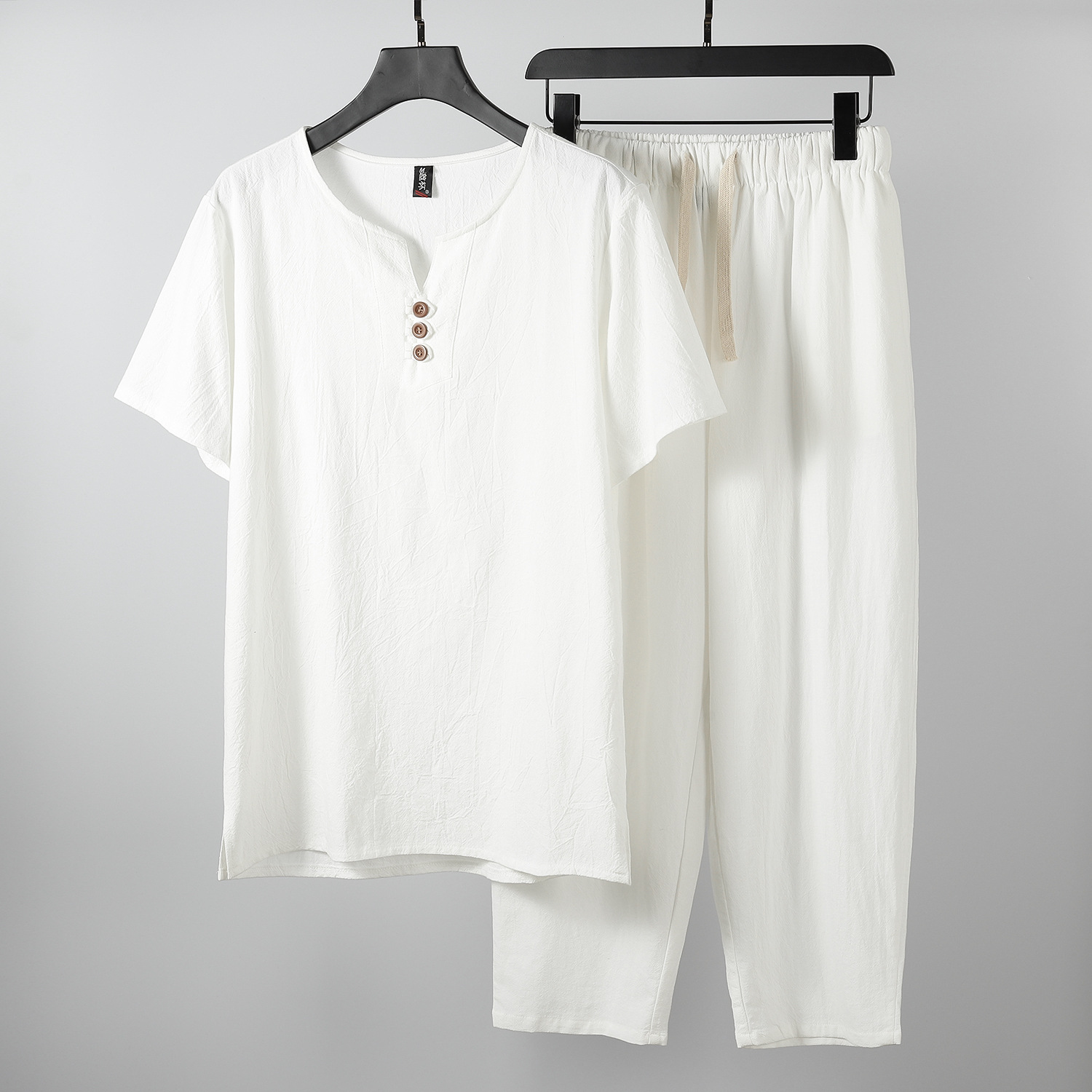 唐装綿麻セット中国風男装青年漢服復古装潮牌亜麻半袖中国式二点セット男