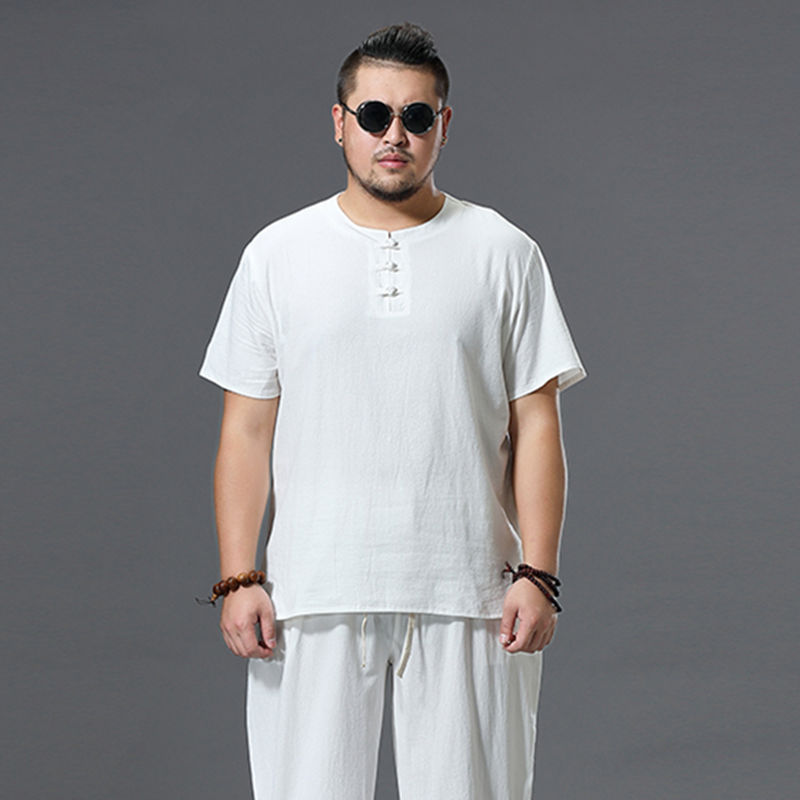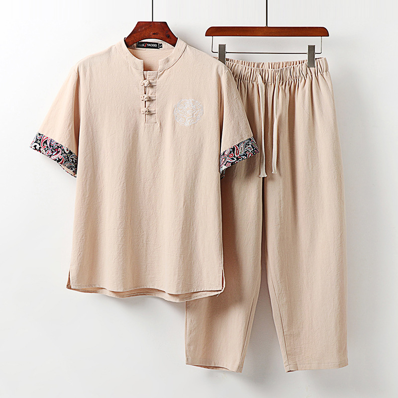 夏の綿麻中国風の成熟した格好と男性服のレトロな亜麻夏の半袖tシャツセット