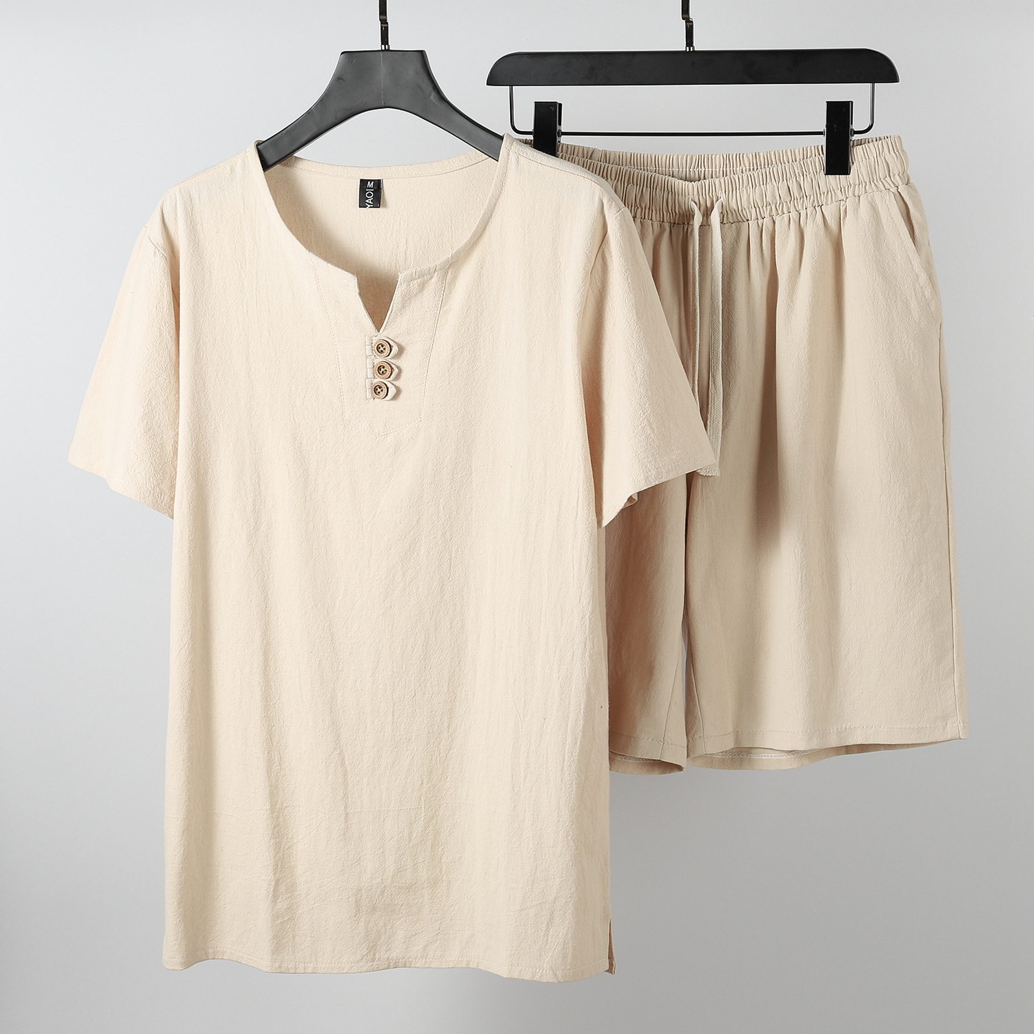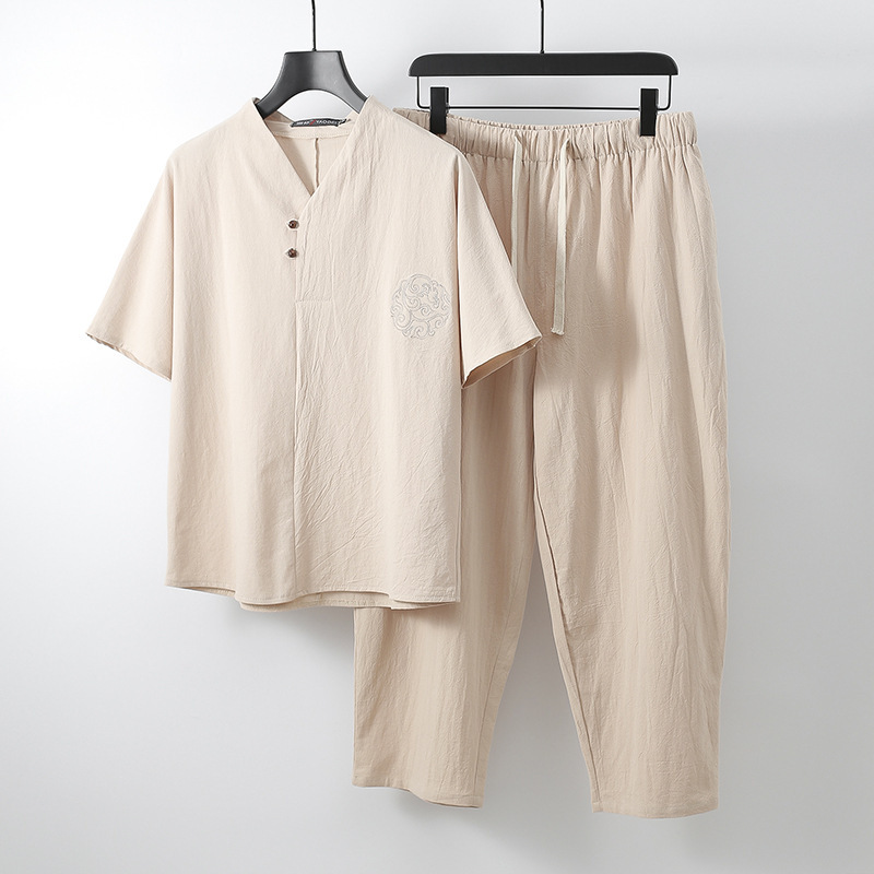 リネン半袖男tシャツセット夏中国風ゆるいvネック半袖上着綿麻ズボン2点セット男