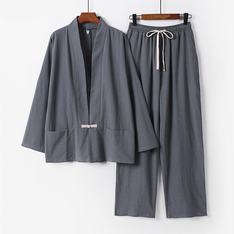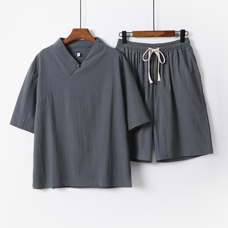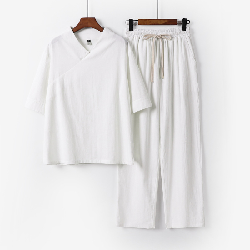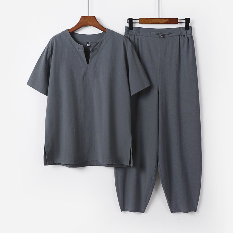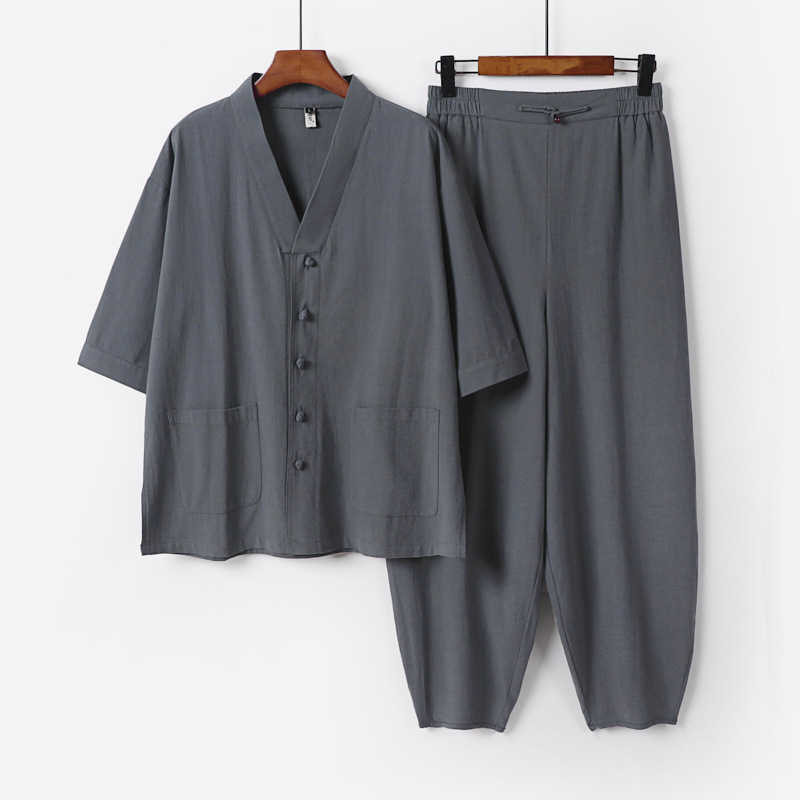春夏綿麻ヨガ太極練習服男中国式禅修居士盤ボタンセット中医館養生作業服