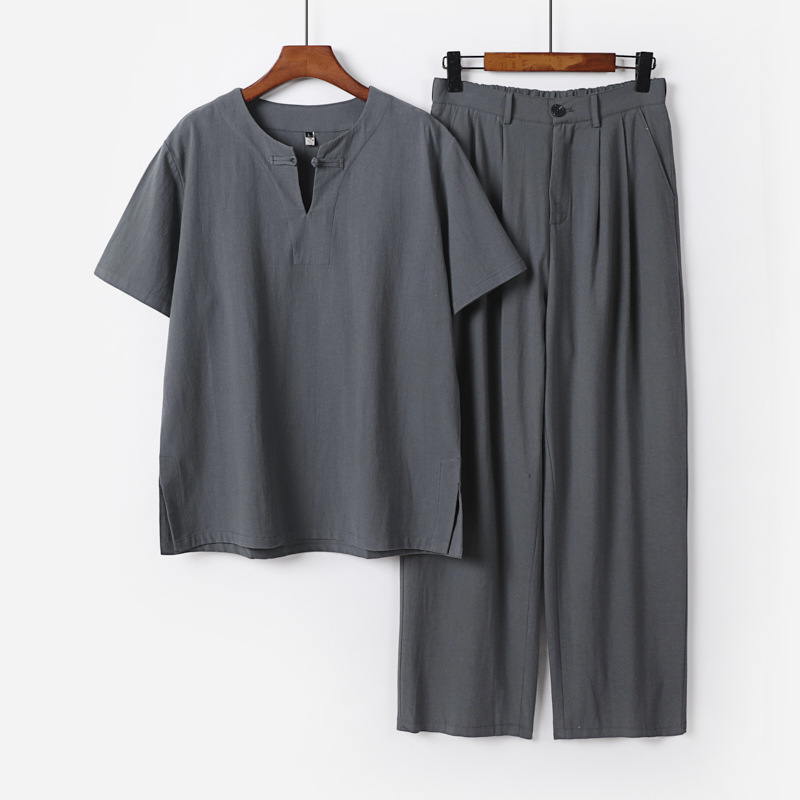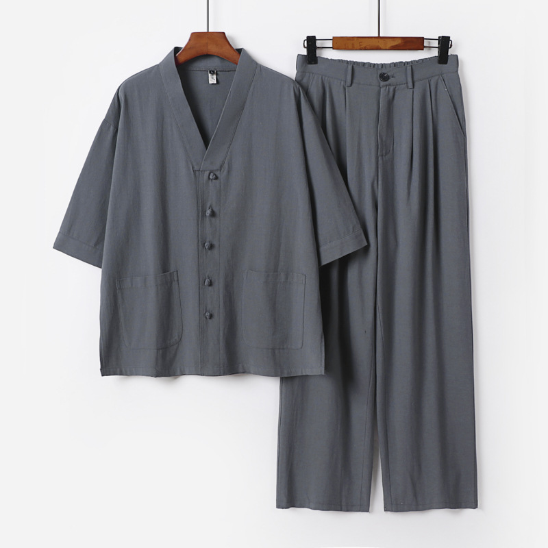 中国風夏七分袖綿麻セット中国式唐装漢服二点セットレトロ茶禅居士服メンズ