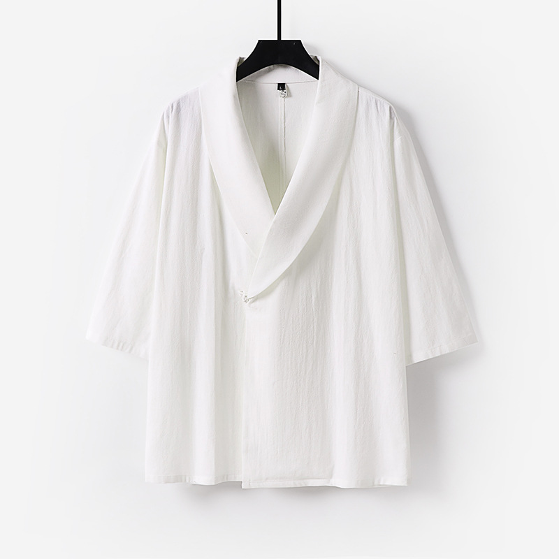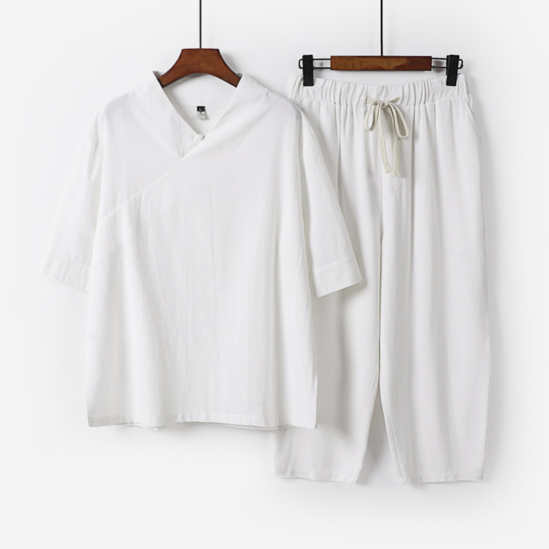 改良漢服中国風亜麻道袍セット男太極七分袖綿麻漢服二点セット大サイズ唐服