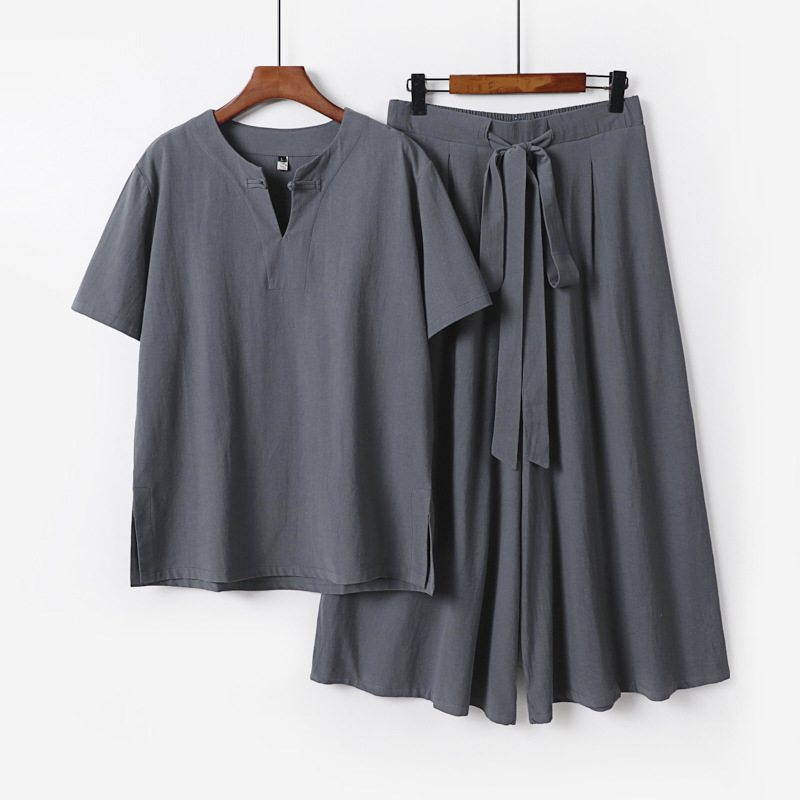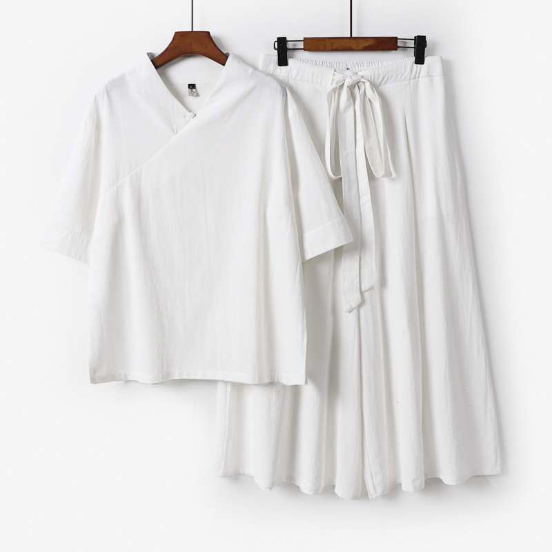 中国風綿麻半袖tシャツ大サイズゆるい民族風盤ボタン復古亜麻九分ズボン二点セット男装