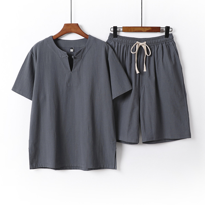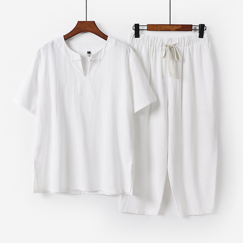 中国風ゆるい夏の綿麻スーツvネックtシャツ亜麻tシャツ男性半袖九分ズボンと2セット男性