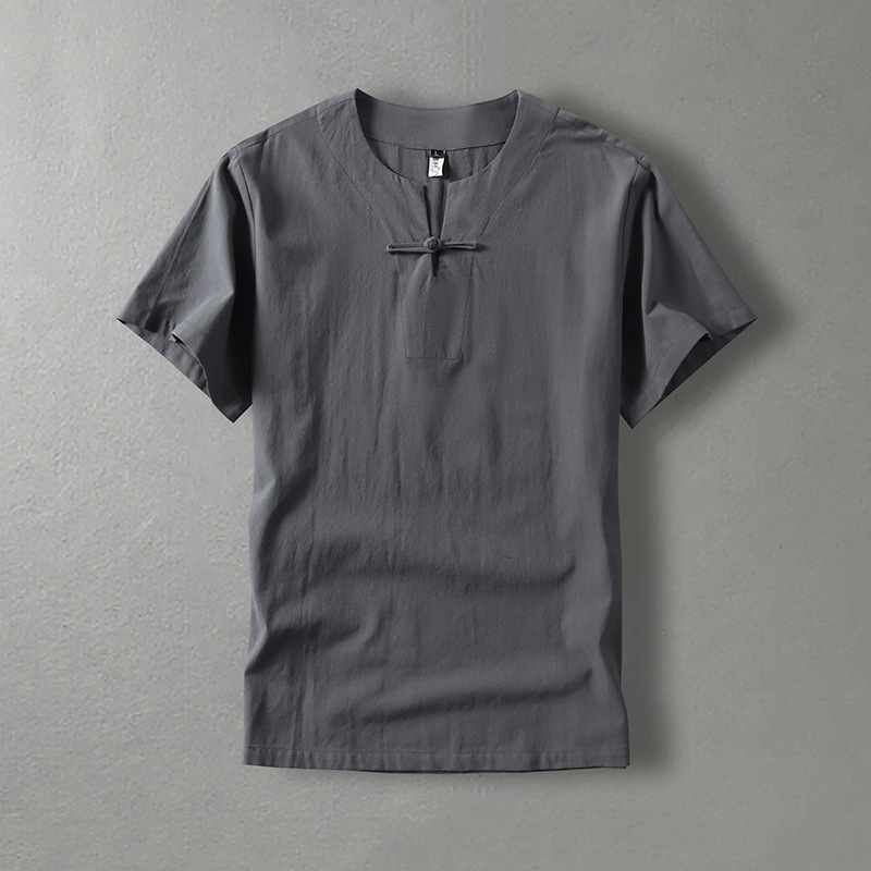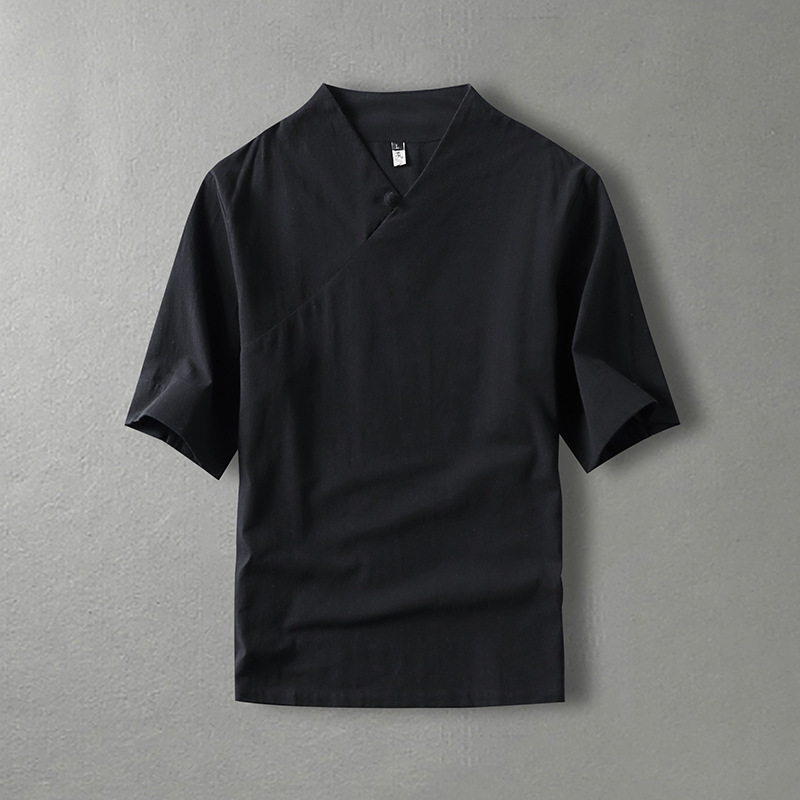七分袖tシャツ男夏新亜麻中国式盤ボタンvネック上着中国風綿麻男服半袖唐装男