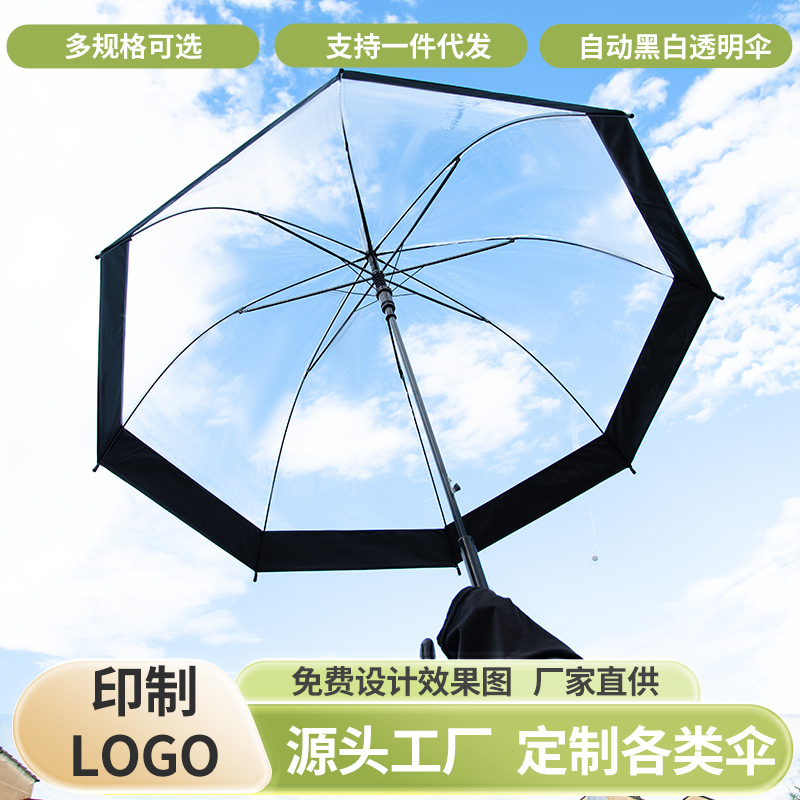 Pvc自動環境保護透明傘長柄広告傘カスタム印刷ロゴメーカー卸売り白黒透明傘