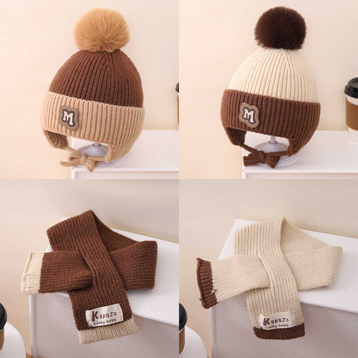 ファッション布マーク幸運熊装飾色合わせの大きな毛玉赤ちゃんニット帽乳幼児保温毛糸帽耳保護帽