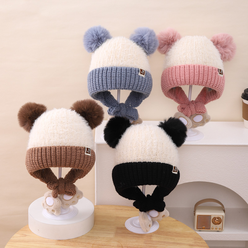 純色のスエードは秋冬に厚い保温児童帽子防寒保温ニットのぬいぐるみ帽子の耳保護帽子です。