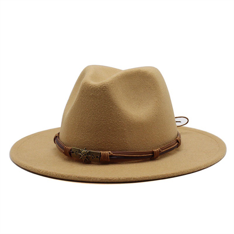 英国風ブラックジャズ大つば帽子 スカルヘッド 秋冬 レトロ フラットブリム ウール帽子 フェルトハット トレンド レザー編みバックル