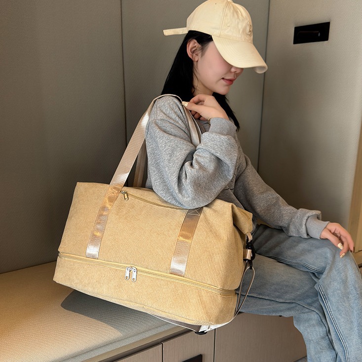 シンプルなカジュアルなコーデュロイの軽やかな旅行バッグ女性2024新型大容量荷物袋乾湿分離フィットネスバッグ
