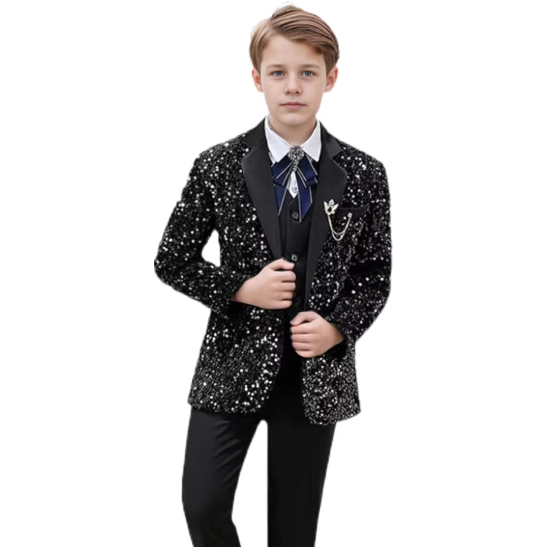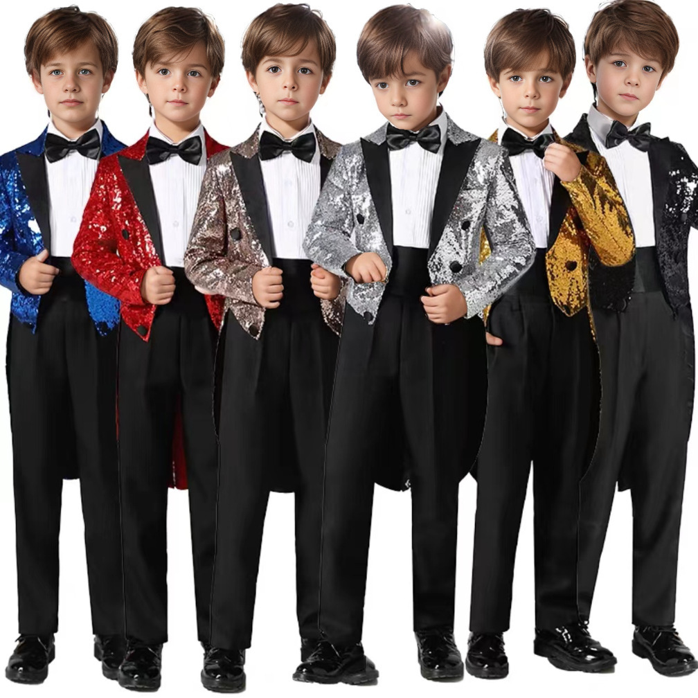 子供用スパンコール付き小さなスーツ、男の子用キャットウォークピアノ演奏パフォーマンススーツ、ハンサムなホストの軽い豪華な小さなドレス