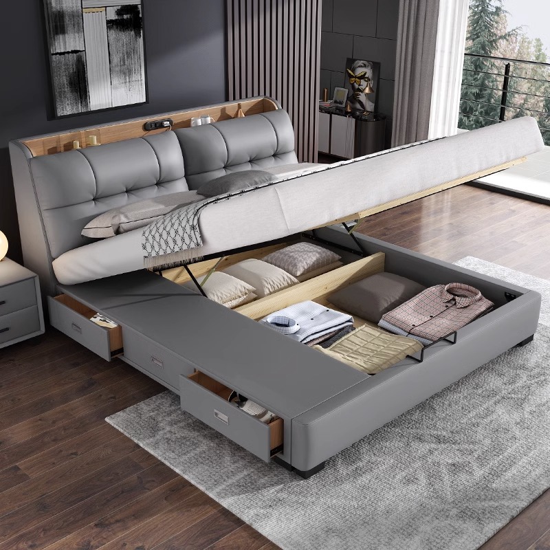 軽豪華な2メートルx 2メートルの主臥大ベッドツインベッド1.8メートル現代シンプルな貯蔵物実木斉辺真皮ベッド結婚ベッド