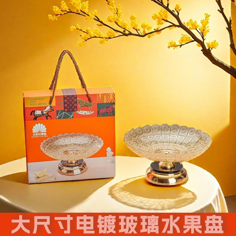 太陽の花のガラスの果物の皿のヨーロッパ式の高い足の果物の斗のホテルの果物のキャンディーの皿は厚い水晶のガラスのお菓子の皿を作ります。