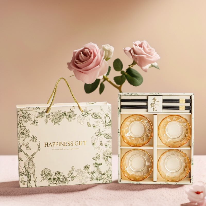 現物卸売り高級メッキ琥珀色ガラス4杯4箸セットガラス碗ギフトボックス中国式プレゼント印刷可能