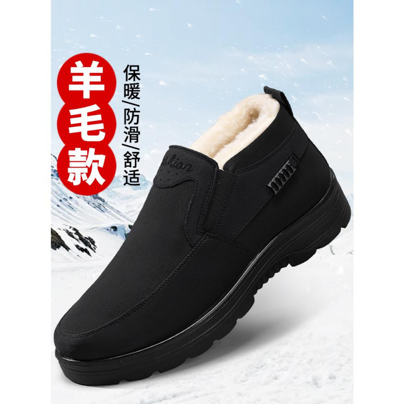 冬用の男性用手作りの古い北京布靴、ベルベットと厚みのあるスリッポン、お父さん用の防水性と滑り止め、高齢者用の毛皮の綿の靴