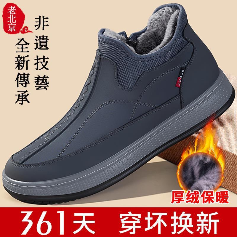 冬用の男性用の古い北京布靴、ベルベットと厚みのある中高年の父親の秋と冬の防水性と不凍性のウォーキング綿の靴、高齢者向け